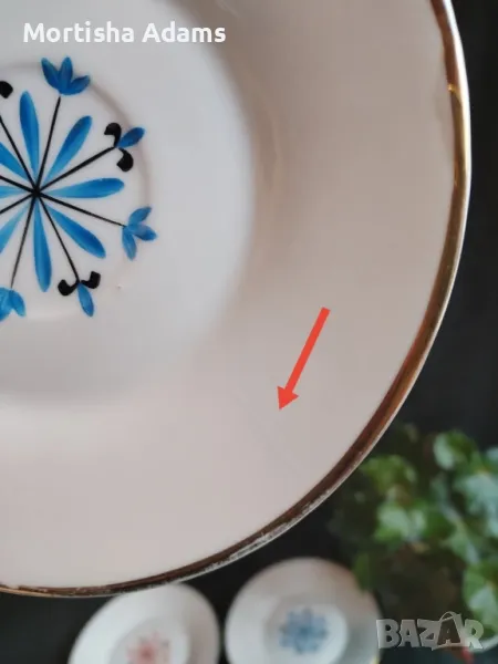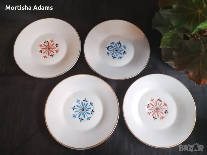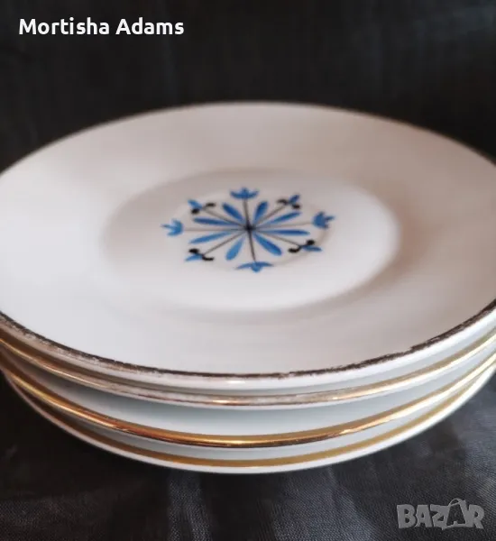 ▪️Чинийки- 4 броя с диаметър 15см. и леки драскотинки на глазурата. Две са с износване на златния кант, една от тях е пукната.