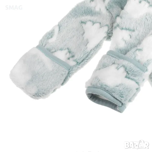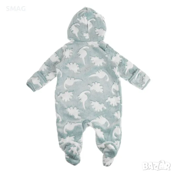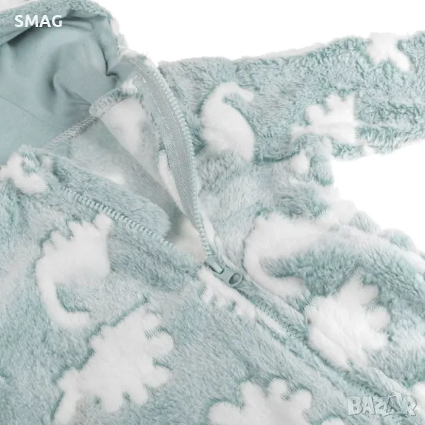 Бебешко поларено боди ромпър в ментов цвят с бяла шарка на динозавър. Закопчава се отпред с цип, който стига до крака. Има качулка със същия дизайн и платнена подплата. Ръкавите имат капак, който можете да завъртите, за да го затворите около ръката на детето.