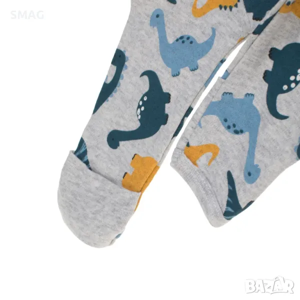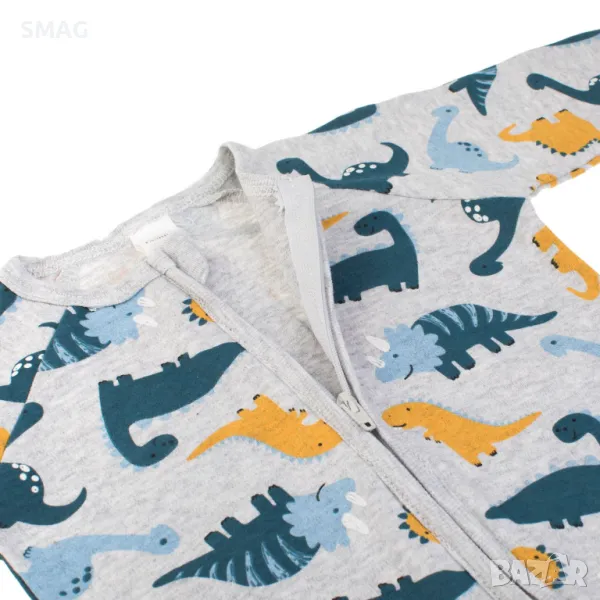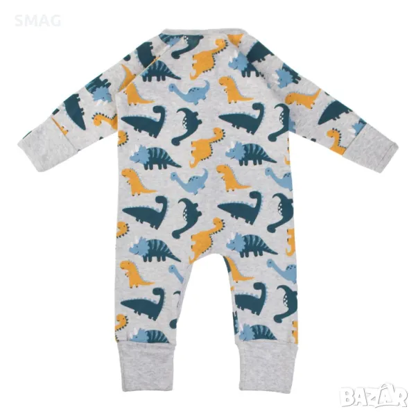 Бебешки памучен сив ромпър с десен на динозавър в синьо и горчица. Закопчава се отпред с цип, който стига до крака. Крачолите и ръкавите му имат капак, който можете да завъртите, за да ги затворите около ръцете и краката на детето.