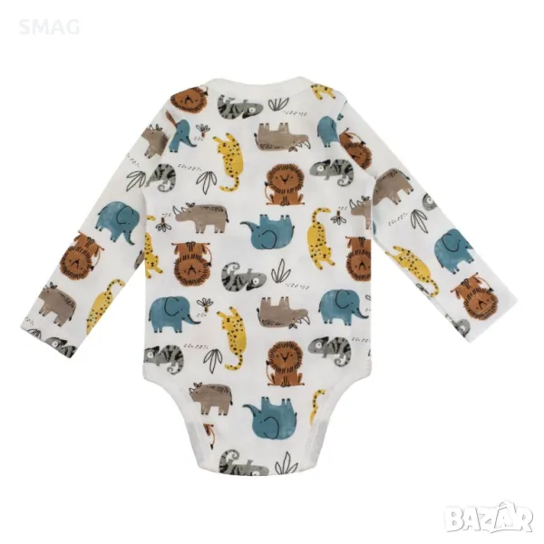 Бебешко памучно боди, с дълъг ръкав, странично закопчаване, бяло с цветна животинска шарка.