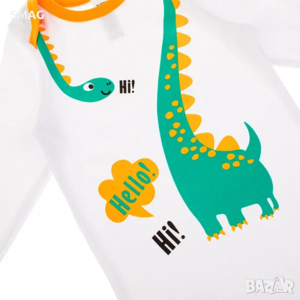 Боди, памучно, в бяло с мотив на динозавър, жълти детайли и надпис "Здравей", с дълъг ръкав и отвор в долната част.