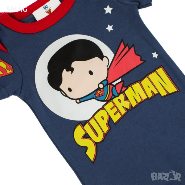 Памучно боди с къс ръкав, синьо и червено с дизайн на Супермен и отвор в долната част.