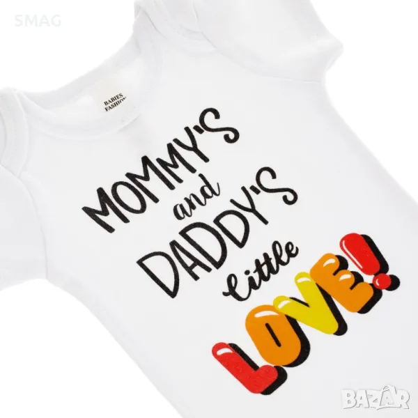 Памучно боди с къс ръкав, в бяло с цветни букви и послание "Малката любов на мама и тати" и закопчаване в долната част.