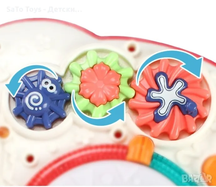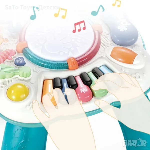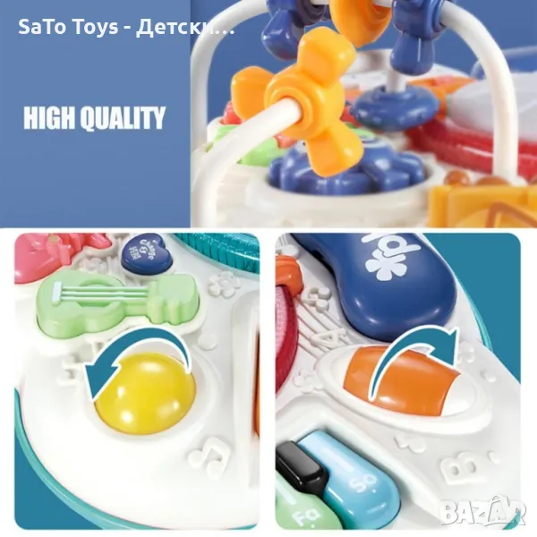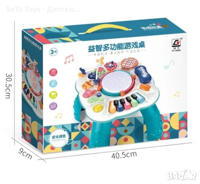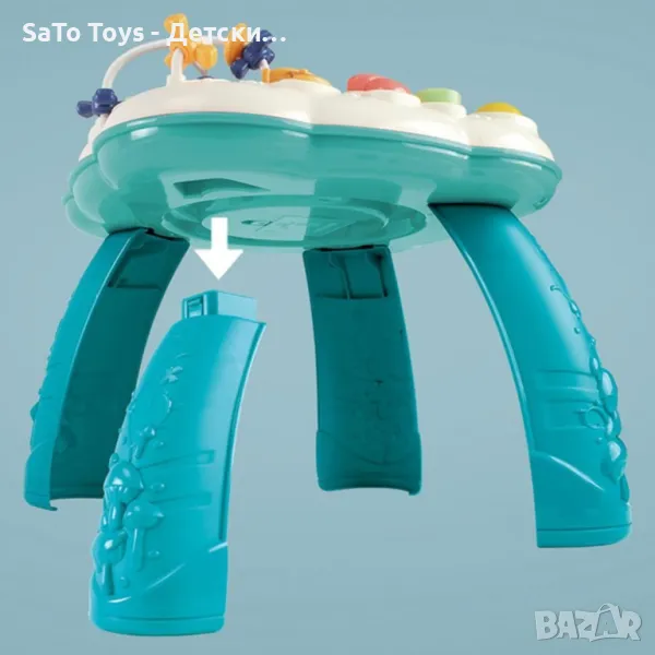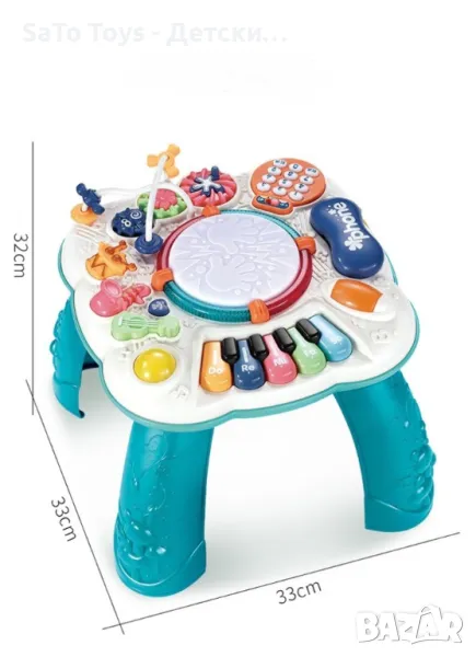 Интерактивна бебешка, музикална масичка с игри. Възраст: 1-3 години. Функции - светлини и звуци. Бутон ON/OFF. Махащи се фигурки, лабиринт, елемент с числа, пиано, въртящо се топче, звук, светлинни ефекти и др. Материал - пластмаса. Размери - 32 х 33 х 33 см. Необходими батерии 3 х АА, 1.5 V.