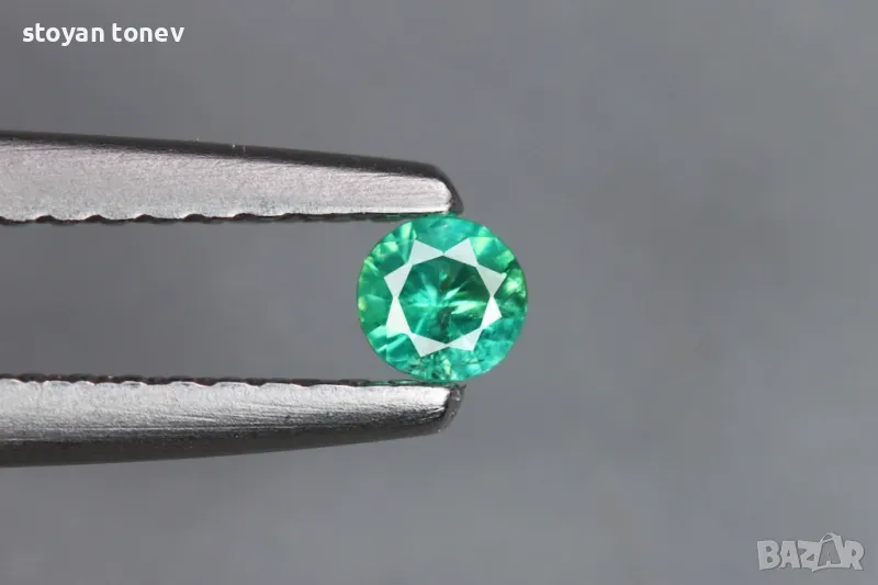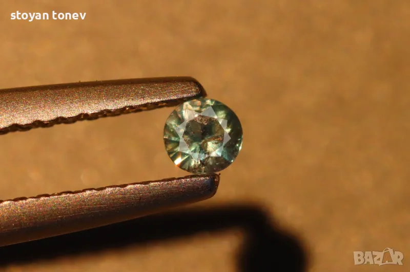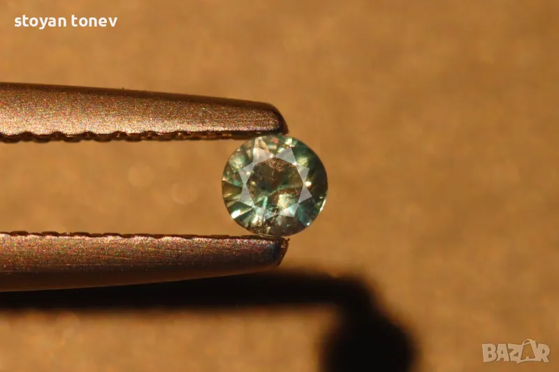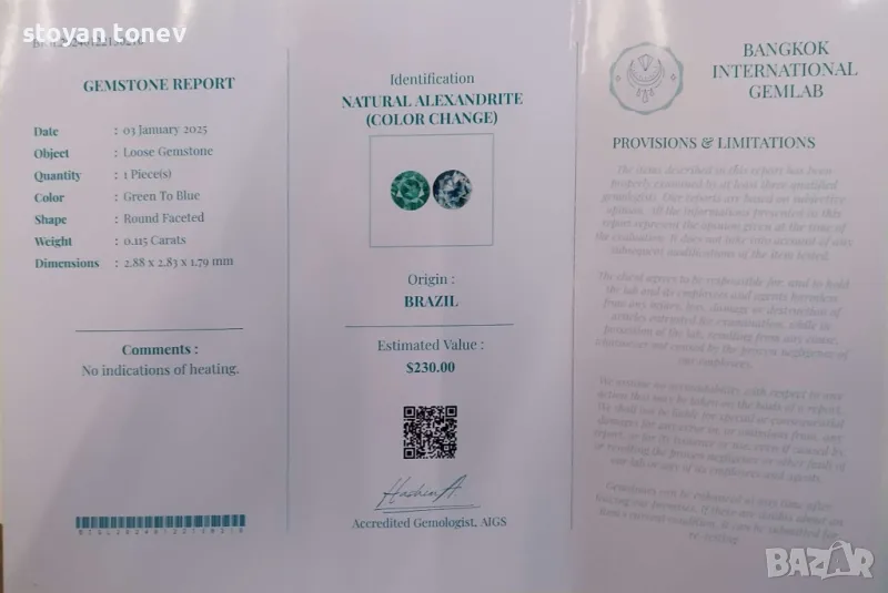 Естествен александрит с тегло 0.115кт. и произход Бразилия. Чистота с минимални видими включения. Цвета е зелен при дневна светлина и се променя на син при жълто изкуствено осветление. Форма брилянт с размери: 2.88 x 2.83 x 1.79 mm.