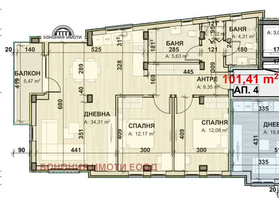 Разпределението на имота е: антре, две спални, кухня, просторна дневна, две бани и тоалетна, мокро помещение, балкон. Жилището е с площ от 114,54 кв.м., като чистата квадратура е 101,31 кв.м.