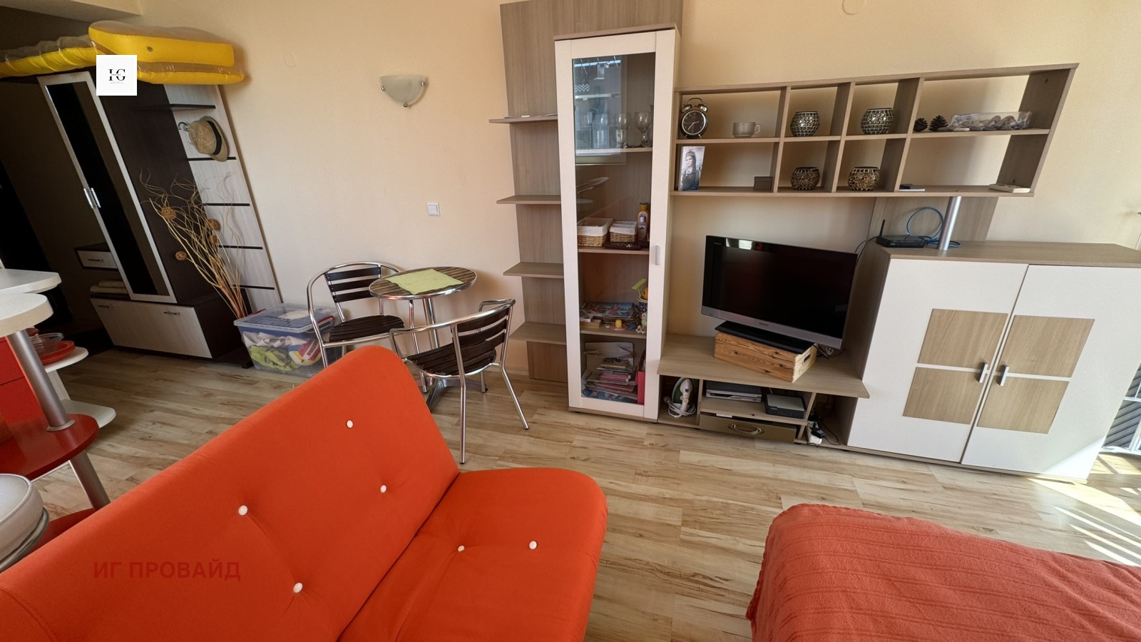 Студиото е с площ от 46 кв.м и се продава напълно обзаведено - с вградена кухня, електроуреди, мека мебел и всичко необходимо за комфортно обитаване. Пространството е организирано функционално: входно антре, баня с тоалетна, дневна зона с кухненски кът, място за хранене, спален кът и излаз към тераса с източно изложение.