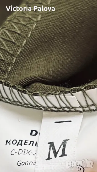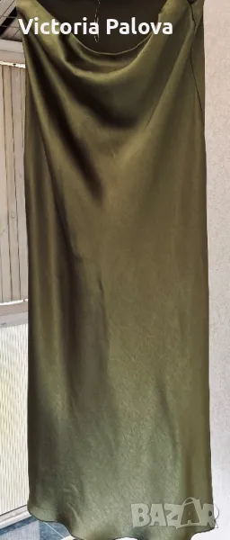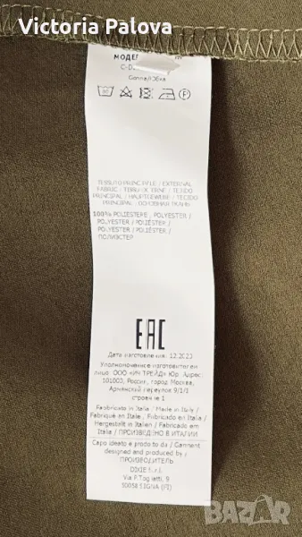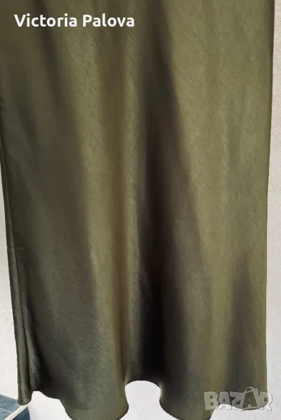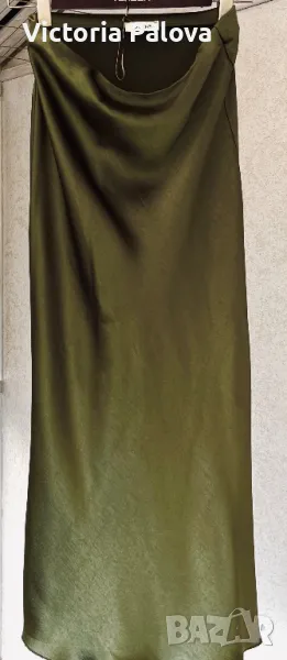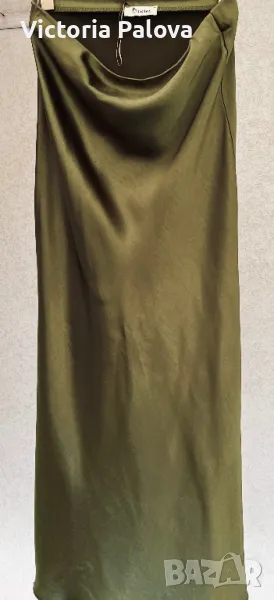 Стилна елегантна пола се вписва идеално в ежедневния стайлинг - тежка плътна “студена” материя с блясък, прекрасен цвят, ушита на верев, разтеглива, ластик в талия - от 36см до 48см, ханш - 55см, дължина - 97см. Отзад горе до талията има по- тъмно място - премахнат е лейбълът на марката, не е драматично, скрива се с горната дреха, цената е съобразена с тази забележка.