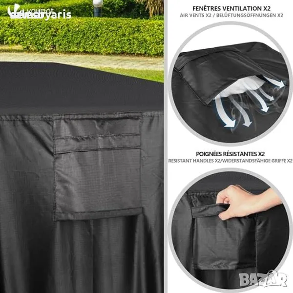 Изпитайте несравнима защита за вашите външни мебели с това водоустойчиво и подсилено покривало. Изработено от 420D Oxford с подсилени линии и многослойно PU покритие, то предлага надеждна защита срещу дъжд, сняг, прах и UV лъчи. Издръжливият дизайн, включващ 140 g здрави материали и водоустойчиви шевове, осигурява цялостна защита. С ветроустойчив дизайн, включващ шнурове и щипки за катарами, вашите мебели остават сигурни дори при силен вятър. Дишащите вентилационни отвори предотвратяват кондензацията, докато двете устойчиви дръжки улесняват лесното монтиране и демонтиране. Почистването е лесно с просто измиване с маркуч или избърсване, а включената чанта за съхранение осигурява удобно съхранение, когато не се използва. Перфектен за различни форми на мебели, включително трапезни маси, мебели от ратан, дивани и маси за кафе. Измерете размера на мебелите си преди покупка за идеално прилягане.