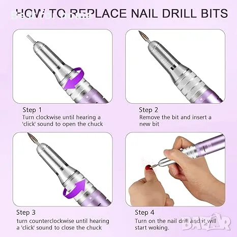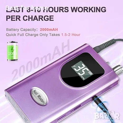 Акумулаторна бормашина за нокти: Пълното зареждане отнема около 1,5-2 часа, а електрическата бормашина за нокти може да се използва безжично непрекъснато до 10 часа. Тази акумулаторна машина за пробиване на нокти е оборудвана с LCD дисплей и индикатор за батерията, които могат да показват ясно оборотите в минута при работа и оставащия капацитет на батерията. Регулирайте бутона FWD/REV, за да промените посоката на въртене.