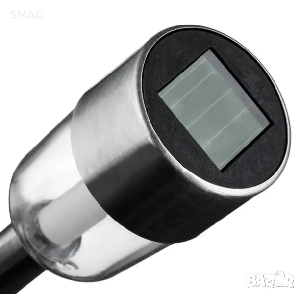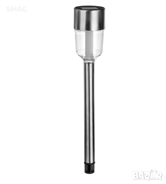 Слънчев соларен фенер кръгъл метален сребърен, с акумулаторна батерия и ярко бял светодиод. Има превключвател за включване/изключване.