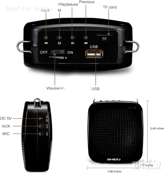 Достъпен и надежден: Микрофонът WB002 с високоговорител е достъпен, но надежден персонален усилвател/високоговорител, който се доставя с Bluetooth слушалка/микрофон, щипка за колан и ремък.