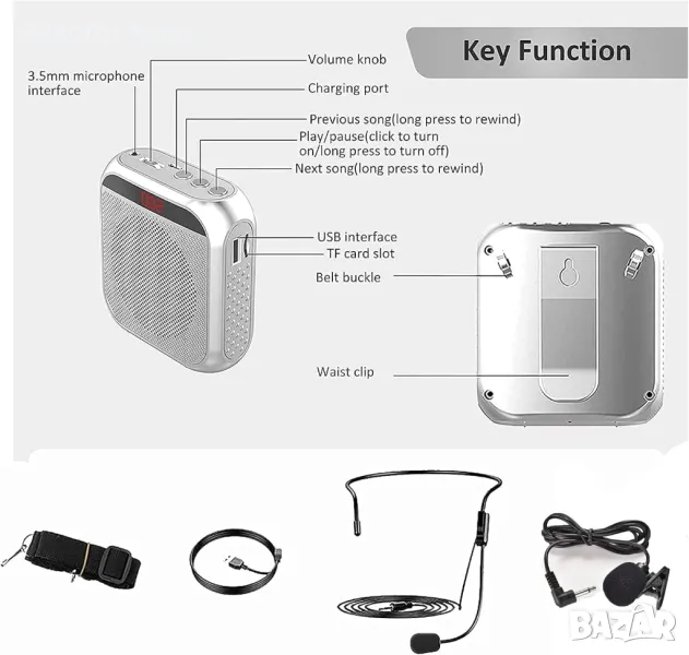 [Компактен, лек и силен]: Този микрофон за учители, въпреки че е малък по размер и лек, той е оборудван с 3-инчов високоговорител, който надвишава общия 2,5-инчов, така че гласът ви може да се чува силно и широко. В допълнение, чрез приемане на технология за намаляване на шума, гласът на говорещия може да бъде ясно усилен.