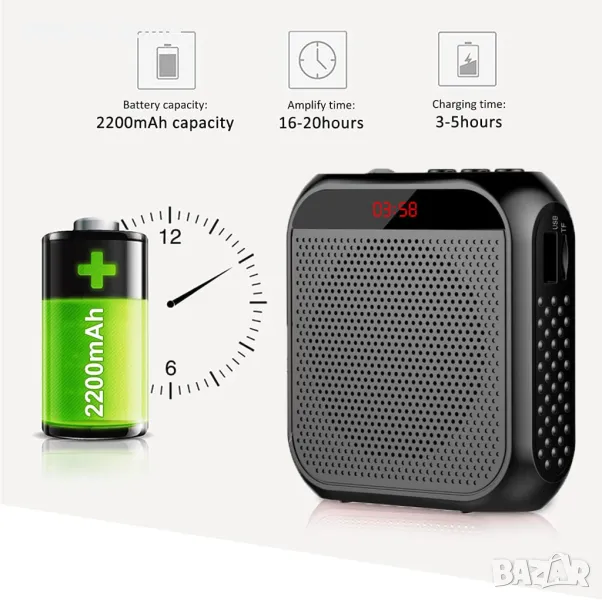 [Дълга автономна работа на батерията]: На нашия преносим гласов усилвател са необходими само 3 до 5 часа, за да се зареди напълно, но може да се използва непрекъснато до 20 часа. Капацитетът на батерията е 2200mAh. Използва висококачествена литиева акумулаторна батерия. Има дълъг живот, който може да се използва 3 или повече години.