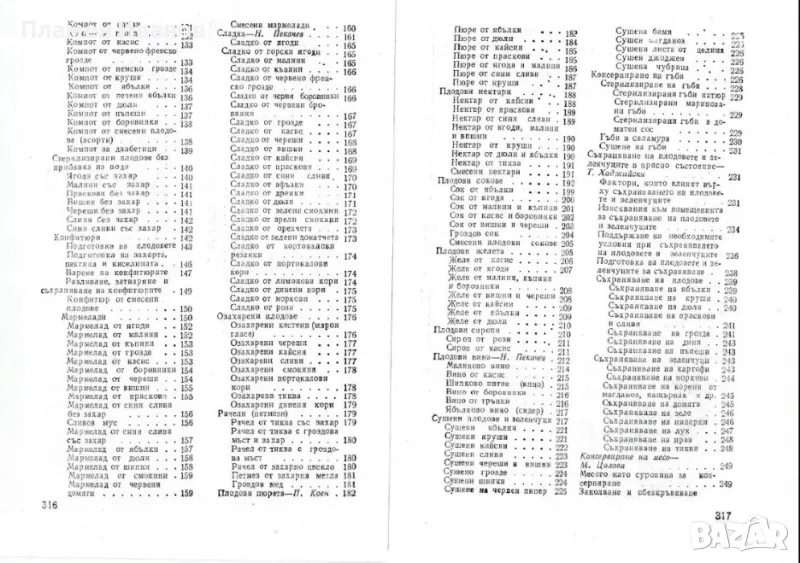 В книгата ще намерите голям брой рецепти за домашно съхраняване както на плодове и зеленчуци, така и на месо и риба. Застъпени са характерни за българският вкус ястия, туршии, компоти, сладка и лютеници. Ще откриете също и различни начини за сушене на плодове, зеленчуци и гъби. Обърнато е внимание и на различните видове колбаси – пресни и сушени, като например небезизвестните „Горнооряховски суджук” и „Панагюрска луканка”. Всички рецепти са съобразени с действащият по него време Български държавен стандарт.