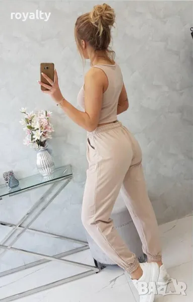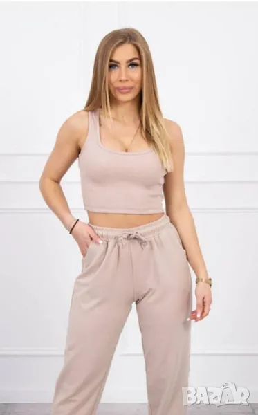 Изработен от памук, комплектът е изключително комфортен за носене през целия ден или пък за тренировка във фитнеса. Бъстието е стегнато и удобно за носене с дебела презрамка, а панталонът е със свободна стрийт кройка.