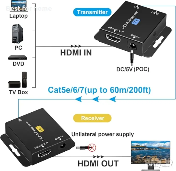 Предварителна покупка: Препоръчваме ви да използвате кабел с дължина от 5 метра до 60 метра и изработен от безкислородна мед CAT6. Разделителната способност е ограничена от оборудването, само най-високата може да предава сигнал с разделителна способност 1080p.