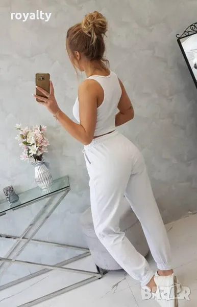 Изработен от памук, комплектът е изключително комфортен за носене през целия ден или пък за тренировка във фитнеса. Бъстието е стегнато и удобно за носене с дебела презрамка, а панталонът е със свободна стрийт кройка.