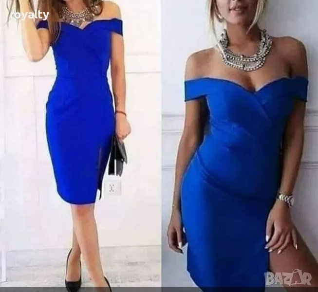 Официална синя рокля с паднали рамена