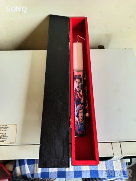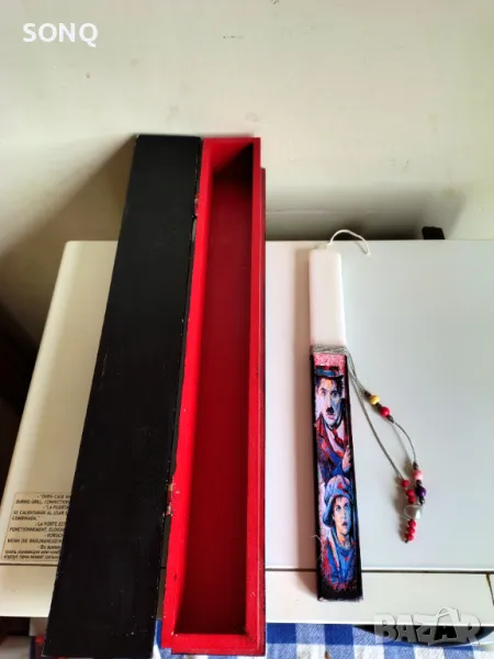 Много красива изработка,във голяма дървена кутия. Със много интересна щампа на Чарли Чаплин и хлапето от филма, Хлапето. Идеална за обикаляне на църквата за Великден. Само за вярващи хора.