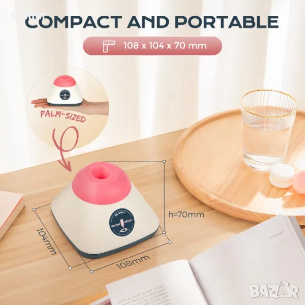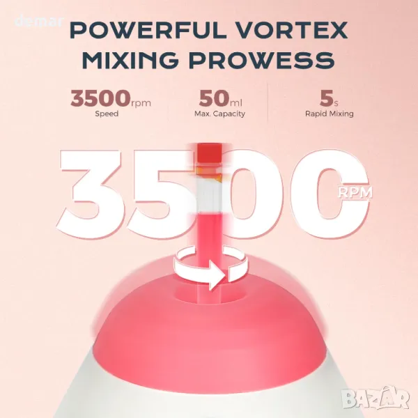 Този компактен вихров миксер осигурява бързо смесване с 3500 оборота в минута само за 5 секунди, идеален за течности, прахообразни вещества и смеси от твърдо вещество и течност. Активира се с просто движение на натискане и освобождаване, той предлага управление с една ръка и плавна работа. Неплъзгащите се крачета осигуряват стабилно смесване без нежелано движение, докато издръжливият безчетков мотор и химически устойчивото ABS и силиконово тяло обещават дълготрайност. Лек и преносим, той е подходящ за лаборатории, училища, салони, студия и други - борави с лекота с всичко - от лабораторни разтвори до гел лакове и мастила.