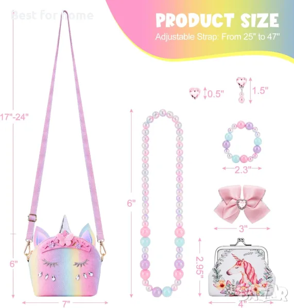 Перфектен размер, подходящ за вашите малки момичета - С регулируема презрамка може да се регулира до идеалната дължина за вашите момичета. Портмонето за малко дете, с размери 7 x 5,5 инча и лек дизайн, е лесно за вашата принцеса да постави всичките си бижута, играчки за игра или всякакви други сладки предмети.