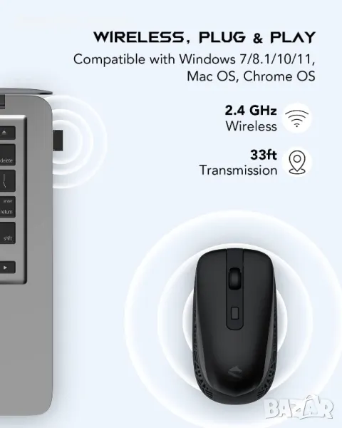 Мишка за лаптоп със стабилна връзка: 2,4 GHz безжична мишка осигурява мощна, надеждна връзка с обхват от 10 метра (33 фута). Това също е Plug & Play. Няма нужда да инсталирате драйвер. Просто поставете USB приемника във вашия лаптоп и мишката е готова за работа.