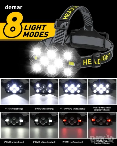 Този акумулаторен челник е снабден с ултра-ярка система от 10 светодиода и батерия с висок капацитет, която се зарежда за 3 часа и издържа до 8 часа, предлагайки яркост и издръжливост далеч над типичните модели. Той включва 8 режима на предно осветление и 2 настройки за задно безопасно осветление, с лесно управление чрез един бутон и функция за дълго натискане на бутон. Регулируемият ъгъл от 90° помага за ясно осветяване на пътя напред, а водоустойчивостта му IPX4 го прави надежден при дъжд. Проектиран за комфорт с регулируеми презрамки, той остава здраво без напрежение при продължителна употреба. Идеален за дейности като къмпинг, бягане или колоездене.