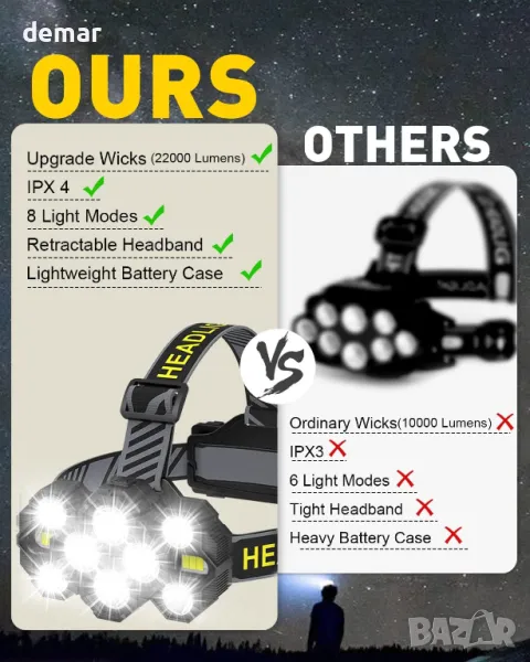 Акумулаторен челен фенер v10000, 22000 лумена, LED супер ярък челник, 10 светодиода, черен
