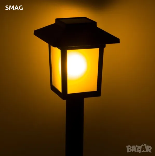 Слънчев фенер соларна лампа с акумулаторна батерия и светодиодна светлина с ефект на пламък. Има превключвател за включване/изключване.