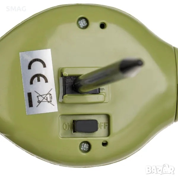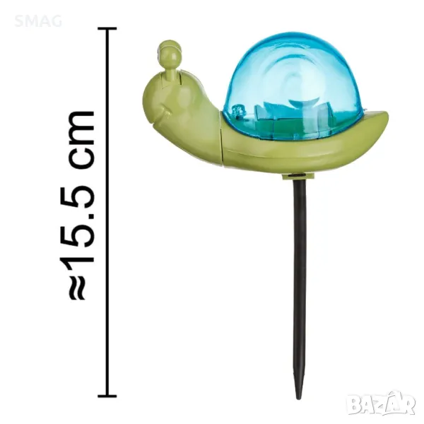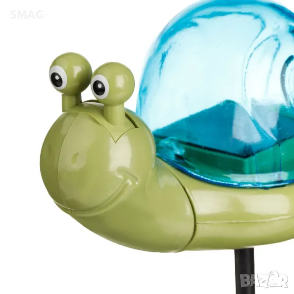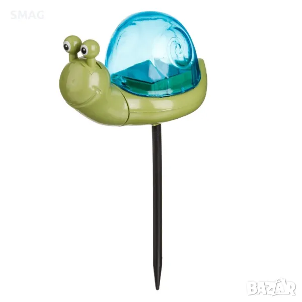Мини соларен фенер с дизайн на син охлюв (15x5 см) със студена бяла светлина. Има акумулаторна батерия 1.2V 40mAh (не се сменя) и бутон за включване/изключване.