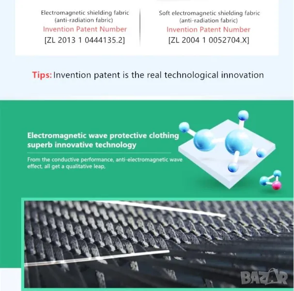 Плата с вградени сребърни нишки се влага в различни облекла и аксесоари, като защитен слой срещу ЕМП/ЕМР. За технологията на производството му е патентован полезен модел.