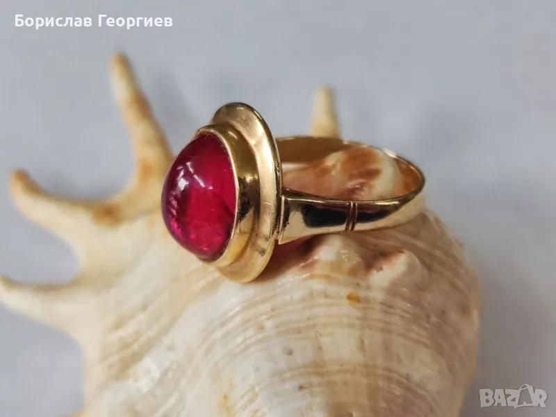 Златен пръстен с проба 14 С 585 и синтетичен рубин.Без печат,но тестван и проверен.Диаметър 16 мм.