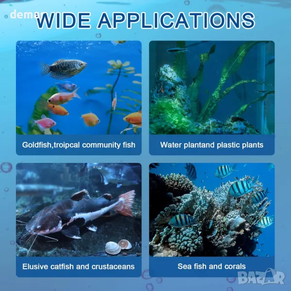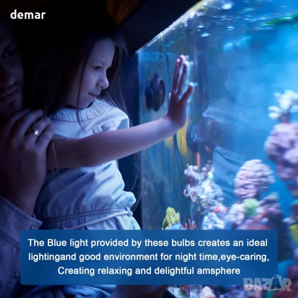 Тази E27 LED крушка за аквариум излъчва хладна синя светлина, която подобрява прозрачността на водата и имитира океанска среда, насърчавайки здравето и жизнеността на рибите и коралите. Тя е идеална за нужди от слаба до средна светлина, включително златни рибки, тропически риби и декоративни растения, и предлага отлична видимост през нощта. Лесна за монтаж в стандартни E27 фасунги, тя е подходяща за различни размери аквариуми и може да се използва и за общо домашно или търговско осветление. Крушката е енергийно ефективна, не съдържа вредни вещества, не трепти и работи безшумно, без топлина или бръмчене.