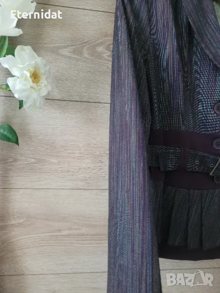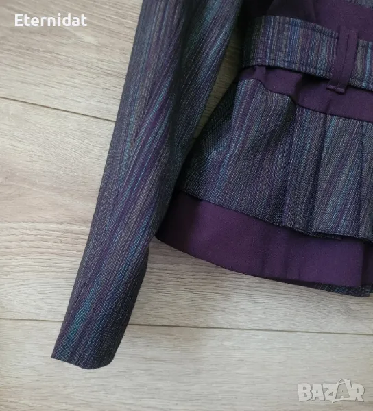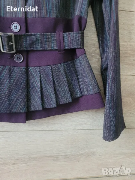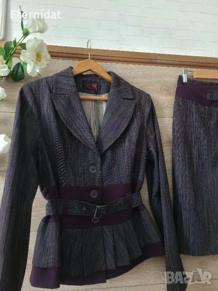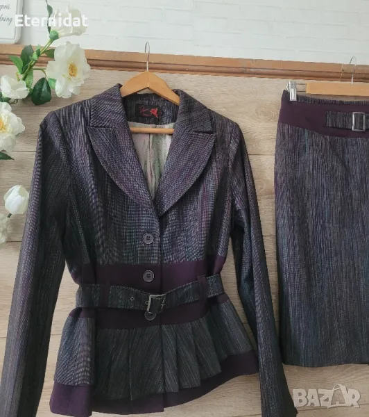Сет от сако и пола ( може и по отделно).1. Сако / блейзър в ефектен дизайн с коланче в талията и леко планирана долна част. Размер М/Л Гръдна 96см, дължина 64см Цена 45лв 2. Офис стил пола с тока в талията. Размер М Талия 39см ( едностранно измерена) , дължина 60см Цена 15лв Обща цена за сета 55лв