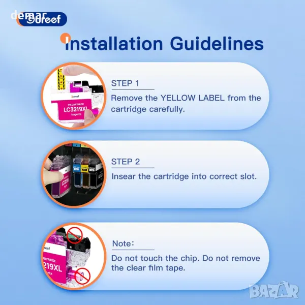 Мастилените касети Gureef LC3219XL са с най-новите чипове за безпроблемна съвместимост с принтерите Brother MFC-J6530DW MFC-J5335DW MFC-J5730DW MFC-J5930DW MFC-J6935DW, предлагайки висок капацитет с до 3000 страници за черна и 1500 страници на цветна касета. Пакетът включва черни, циан, магента и жълти касети, което ги прави подходящи за редица задачи - от документи до печат на ярки снимки, покривайки ефективно всички нужди на дома и офиса.