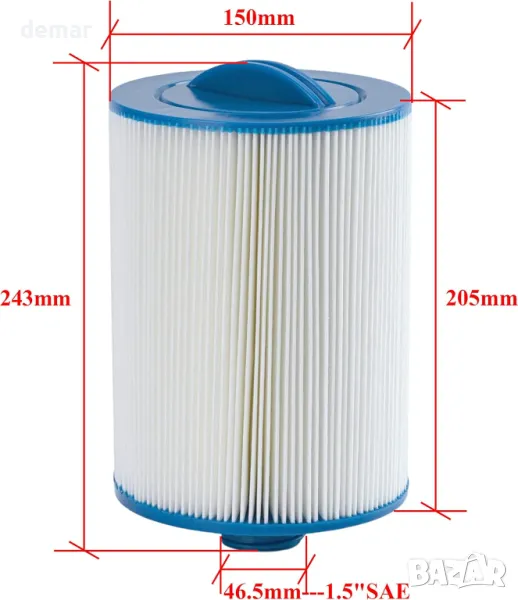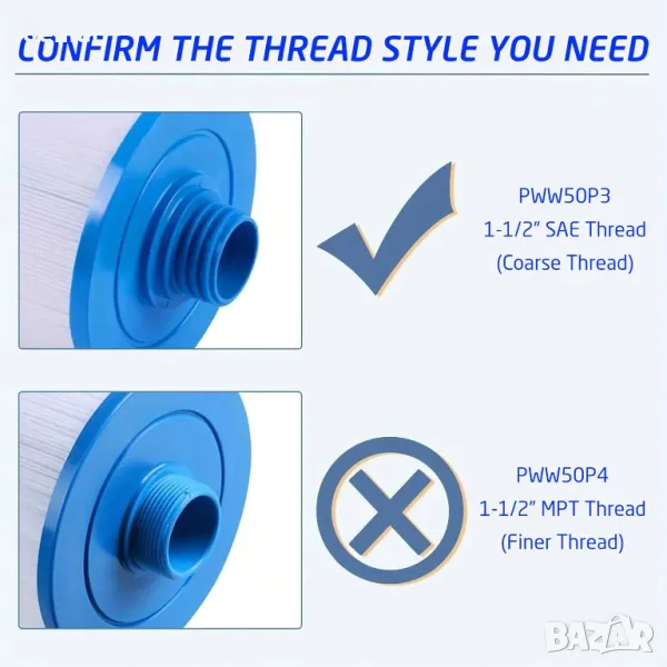 Този комплект от 2 резервни филтърни патрона е предназначен за спа и басейнови системи, съвместими с модели като PWW50P3, 6CH-940 и FC-0359. Всеки патрон е с дължина 20,5 см и външен диаметър 15 см, с дръжка отгоре и вътрешен диаметър 3,8 см с едра SAE резба (не е подходящ за фина или MPT резба).