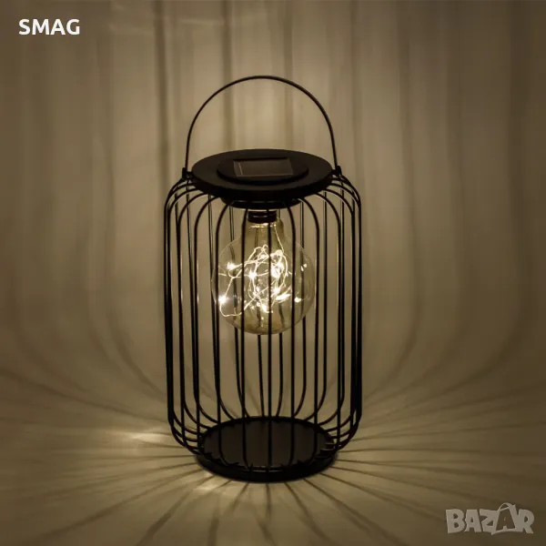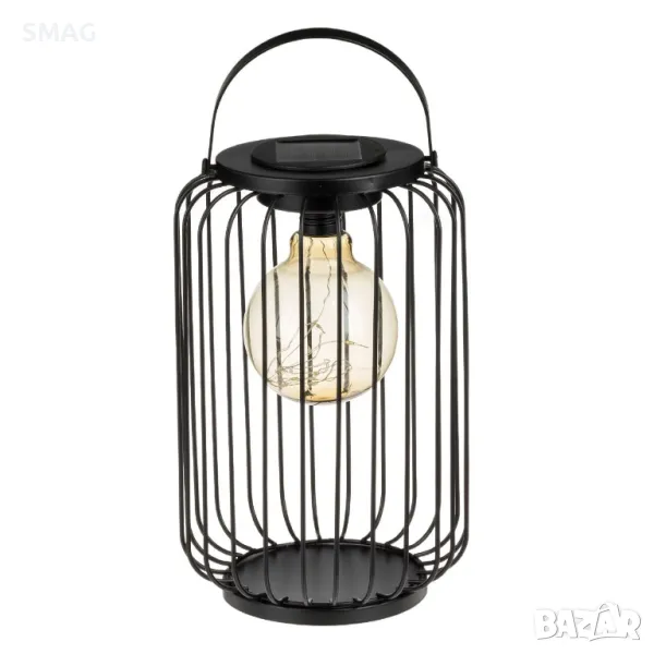 Соларен подов фенер, висящ, във формата на черна клетка, с голяма кръгла лампа с бели LED светлини. Свети автоматично през нощта и може да го закачите на металната халка. Има акумулаторна батерия и превключвател за включване/изключване.