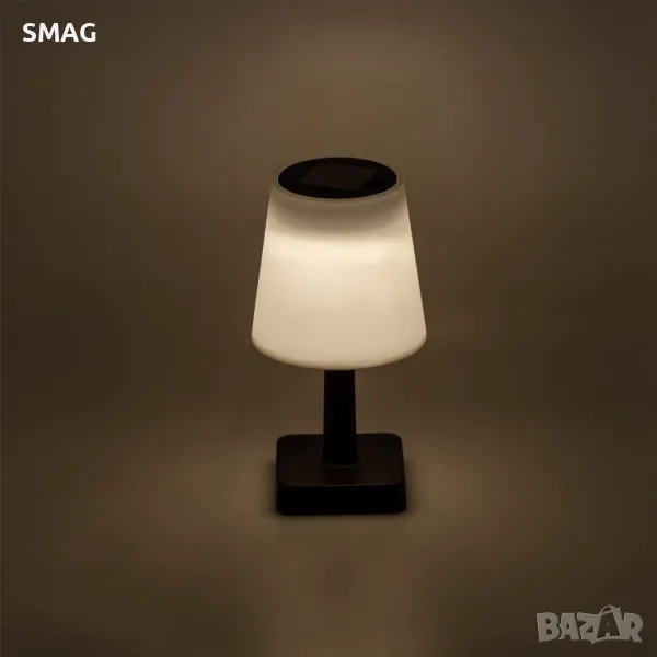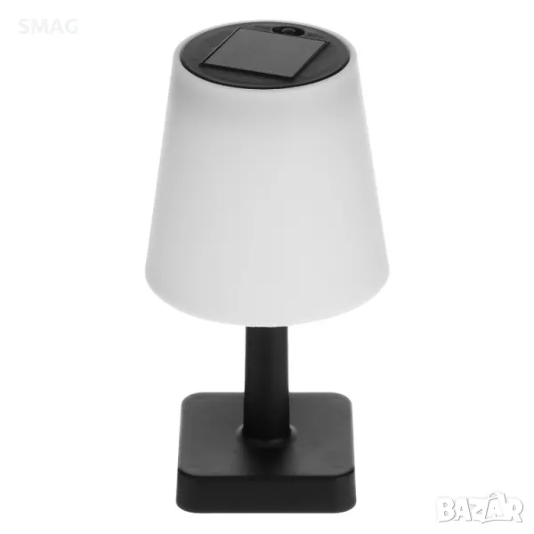Соларна настолна лампа с черна пластмасова основа и бяла шапка. Има бутон за включване/изключване.