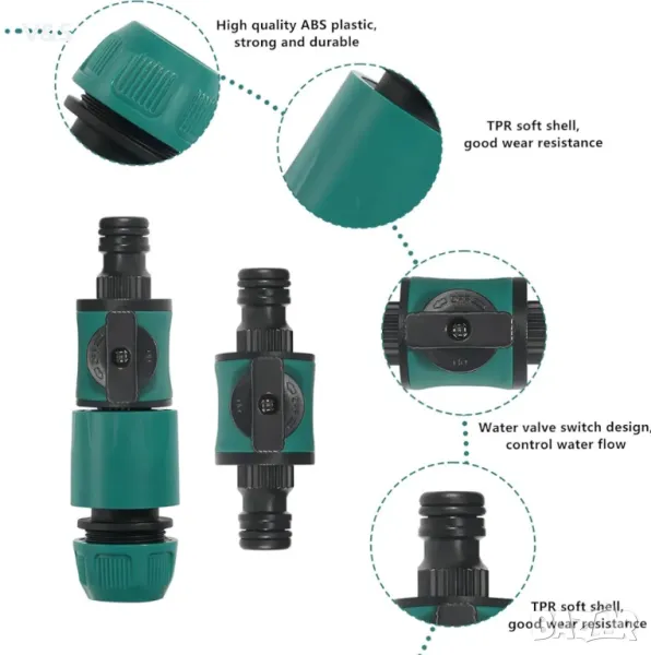 Висококачествена ABS пластмаса: съединителят на маркуча с регулиращ клапан е изработен от ABS пластмаса с TPR мека обвивка, която има добра устойчивост на удар и износоустойчивост, може да се използва при изключително ниски температури и няма пукнатини поради ниски температури. Стандартна резбова връзка, добро уплътнение, без изтичане при свързване.