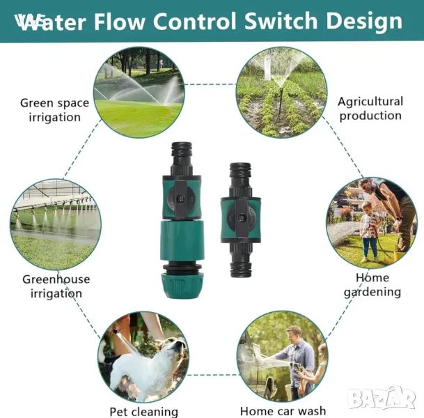 Широки приложения: съединителят за маркуч може да се използва в системи за напояване на селско стопанство, тревни площи, градини и оранжерии, напр. За напояване на обществени зелени площи, домашно градинарство, селскостопанско производство, градинско производство, миене на автомобили вкъщи, почистване на домашни любимци и др.