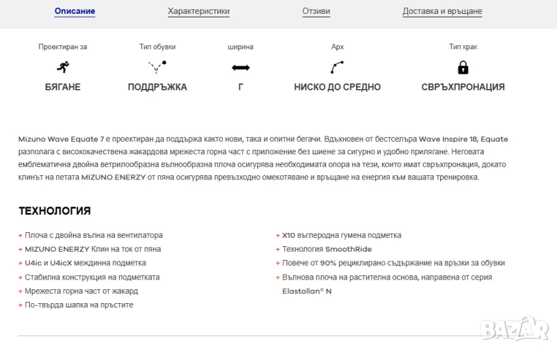 - MIZUNO ENERZY Пяна, която осигурява невероятно омекотяване и връщане на енергия в клина на петата.