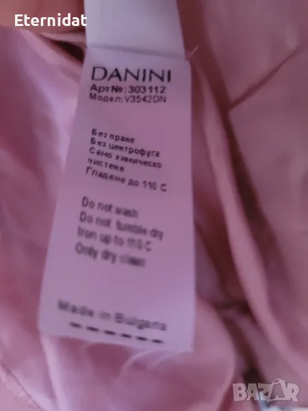 Елегантен модел сако DANINI. Лек блясък в плата на светлината. Розов хастар .Метален знак на марката ори джоба. Размер Л Гръдна 96-100см, дължина 60см Цена 32лв