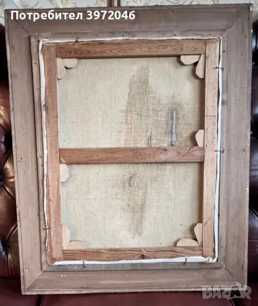 • Състояние: Има реставрация – платното е било скъсано, рамката има следи от времето (ожулена боя).