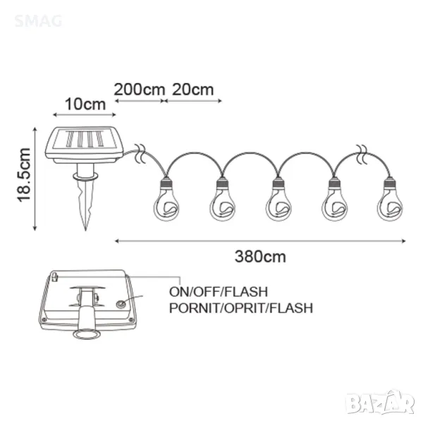 Соларен гирлянд с пластмасови цветни крушки, захранвани от слънчева светлина, безжични и екологични. Съдържа акумулаторна батерия. Има бутон за включване/изключване.