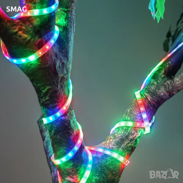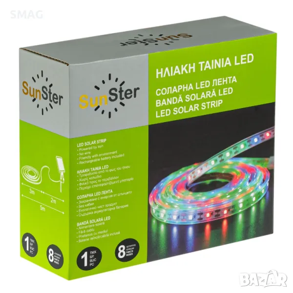 Соларна LED лента с цветна светлина, захранвана от слънчева светлина. Екологичен с акумулаторна батерия. Има бутон за включване/изключване и бутон за режим с 8 функции. Има индикатор за светене и зареждане. Пакетът съдържа торба с еластични опори с винтове.