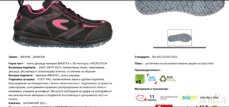 Капачка : АЛУМИНИЙ 200 JCofra Eva S1 P SRC е част от ексклузивната дамска линия RUNNING на Cofra – пригодена за работнички, които искат комфорт, безопасност и дишане. Отличаваща се със стилен, но много функционален дизайн, тази обувка включва дишаща горна част BREATEX 3D , междинна подметка APT PLUS Zero Perforation и 200J алуминиева капачка на пръстите . Неговата анатомична стелка FOOT-PAD със самоформуващ се полиуретан се адаптира към формата на вашия крак, осигурявайки дълготрайна опора и омекотяване дори при продължително носене.