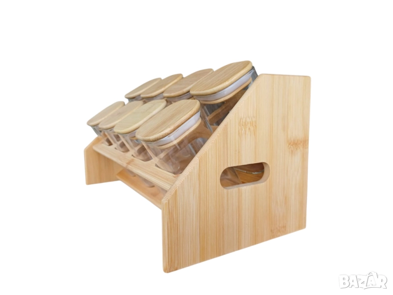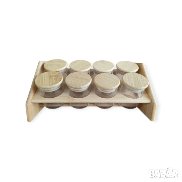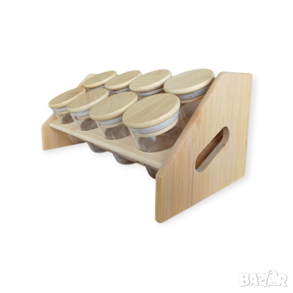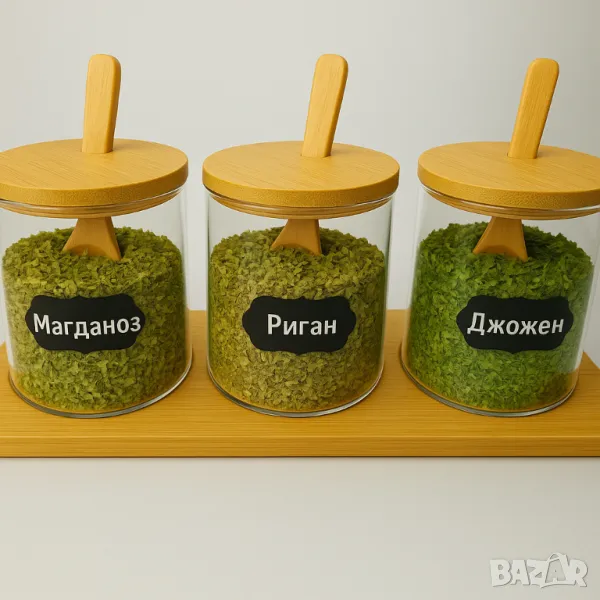Комплекти бурканчета за подправки със стойка, бамбукови капачки и етикети на български
