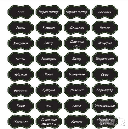 36 етикета на български език - 32 с най-често използваните подправки и 4 празни за персонализиране по ваш избор.