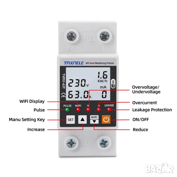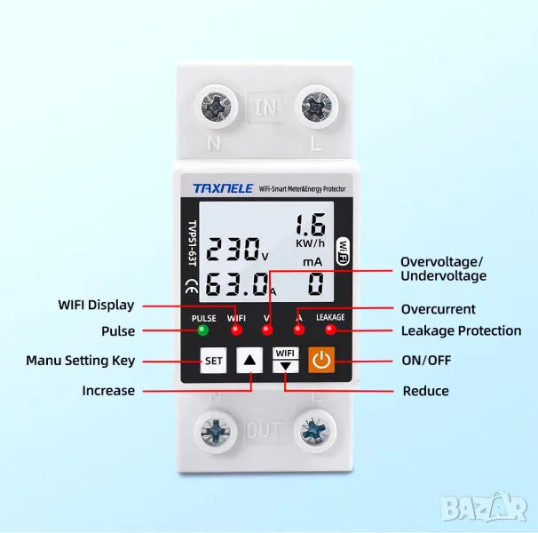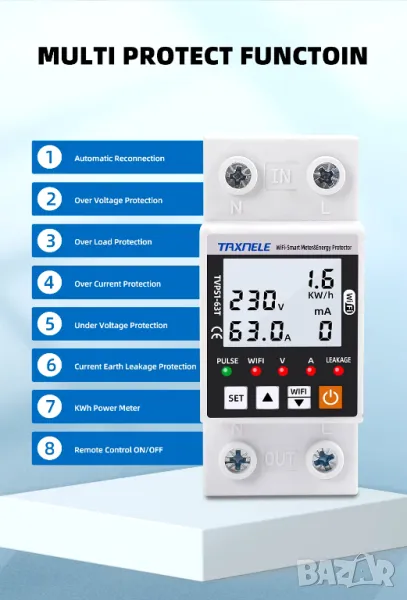 - Удобна инсталация: Устройството е проектирано да отговаря на размерите на 35 mm DIN шина, което го прави лесно за инсталиране и интегриране в съществуващи електрически системи, с удобен за потребителя интерфейс и възможности за дистанционно наблюдение чрез приложението TUYA.